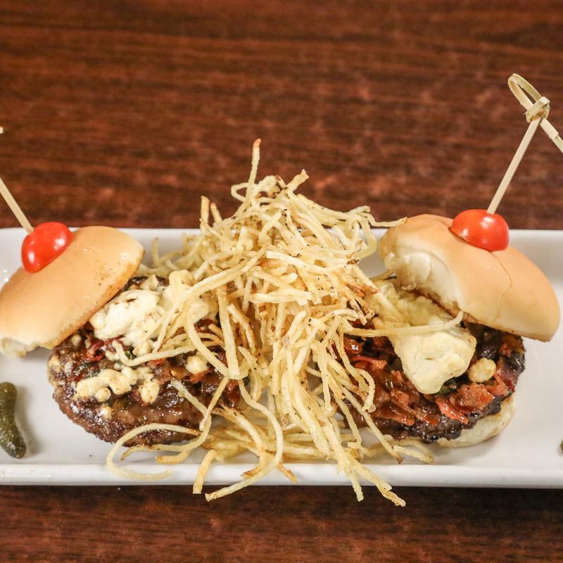 Juicy Kobe beef sliders topped with jalapeno bacon jam and goat cheese mousse, served with haystack potatoes