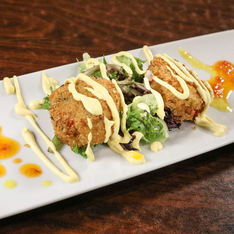 Golden jumbo lump crab cakes with a saffron lemon aioli