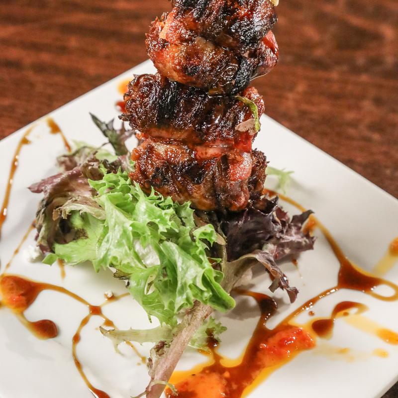 Sweet dates filled with goat cheese, wrapped in crisp bacon, drizzled with balsamic reduction