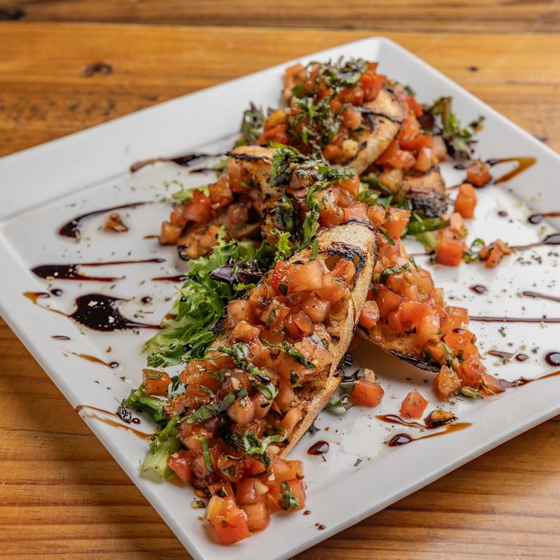Toasted crostini layered with fresh tomato, basil, garlic, balsamic reduction and extra virgin olive oil