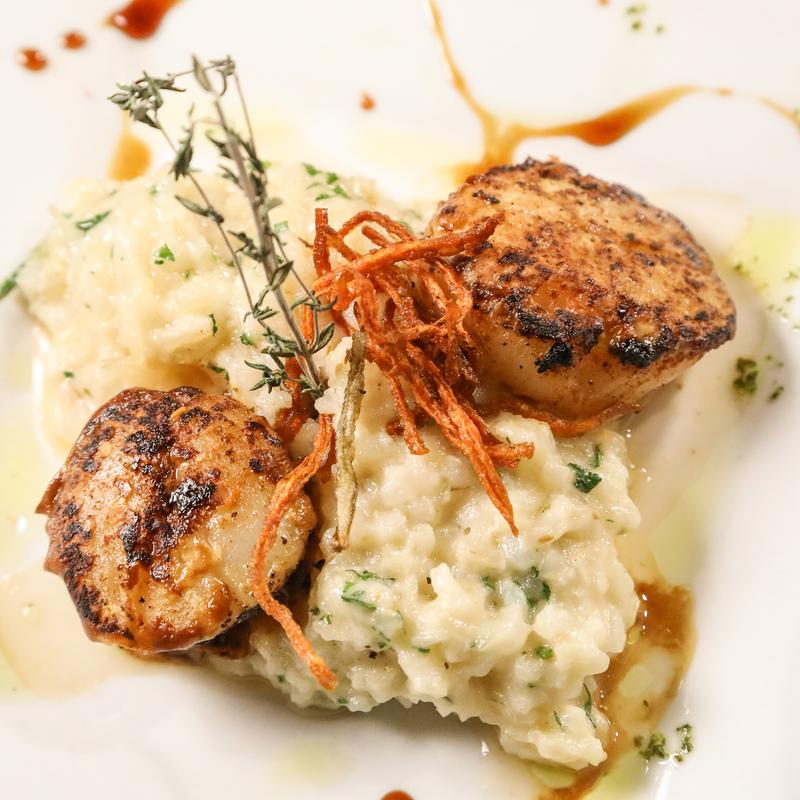 Pan seared scallops over creamy parmesan risotto, citrus beurre