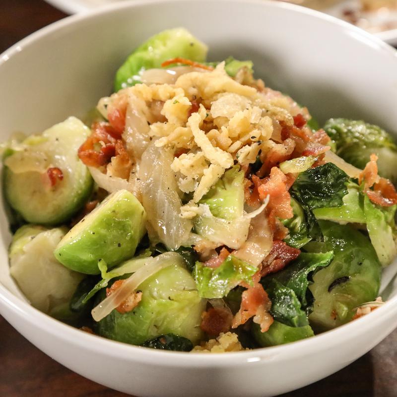 Sautéed sprouts tossed with bacon, caramelized onions, chili flakes
