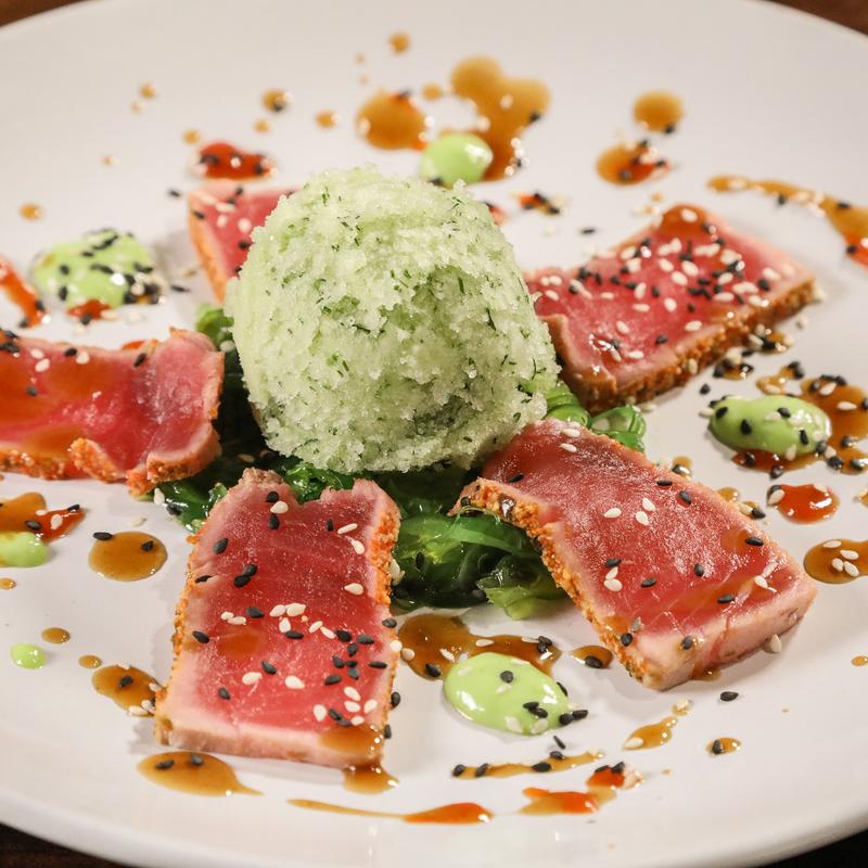 Seared tuna brushed with Japanese seven spice, paired with with cucumber sake sorbet, seaweed salad, ponzu gastrique